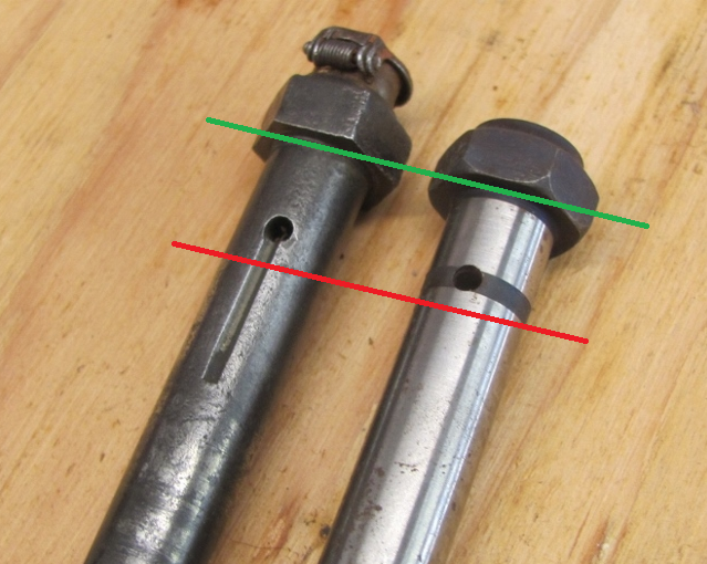 There were a few different styles of spindle bolts (king pins). One difference was based on year as noted below. The Twist style was threaded into the top of the spindle while the Flip Top was unthreaded and just pressed in. The bolts had slight different designs. The depth for the cap is about were the green line shows and the red line is a smaller diameter hole from green line to red line. The external groves around or parallel to the bolt are intended to allow the lubricant to flow to the lower bushing. ---Also as James states the oil filler hole may be plugged with dirt or even a bent flip top cap. Take a good look