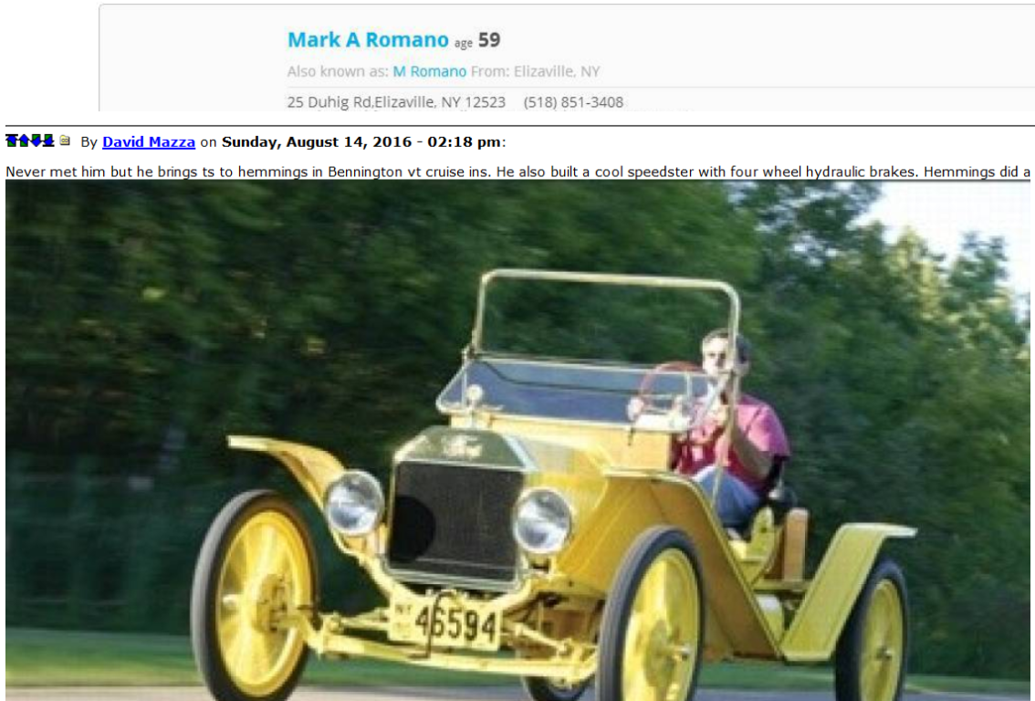 Looking for Mark Romano of New York and his beautiful 1915 Speedster with Rootlieb body that was featured in the February 2005 Hemings Classic Car magazine. Anyone see him at cruise ins or local car shows? Thanks! 314-287-1901 Would like to discuss his car with him. Photo below.
