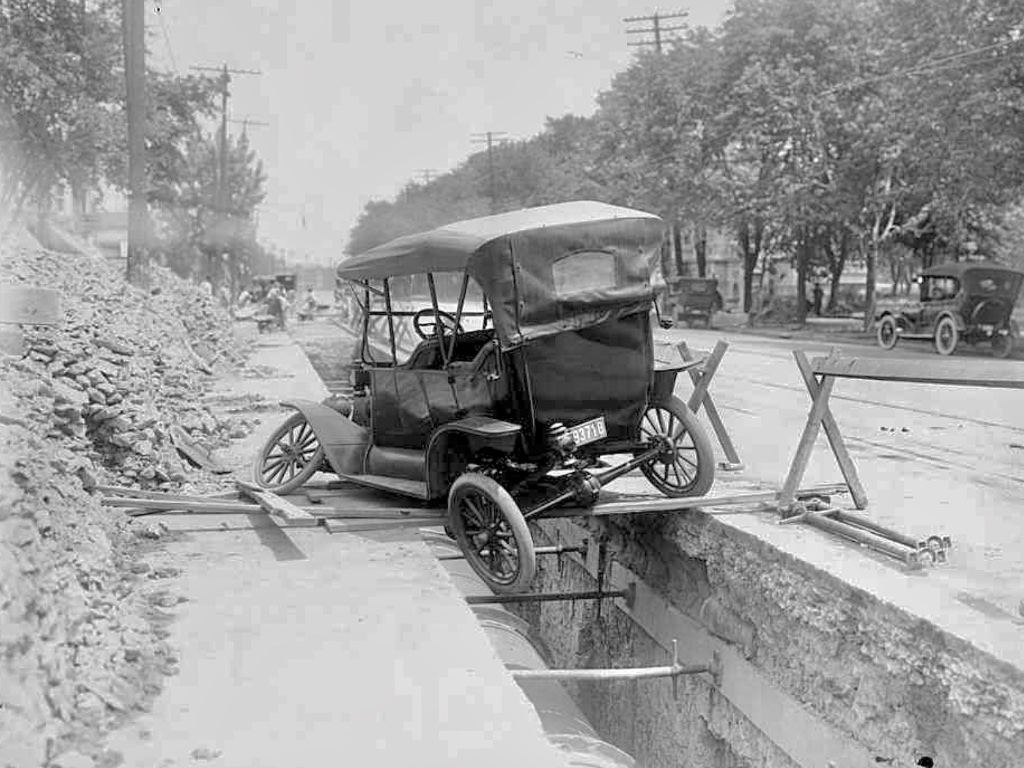 The first picture in interesting. The woman at the top of the bank looks like she is pulling the car with a rope. The men are either standing around or look like they are trying to push the car. I think they will need a tow truck to get it out. Don't know how the wheels are.