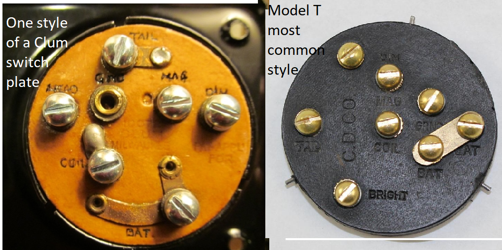 The description of repairing the switch is no different than it would be for the pin type that the Model T suppliers sell (when in stock). However the layout is not exactly the same. But there are Clum backing plates that are the same as the common Model T so its necessary to see the backing plate and internal parts to properly ID a switch.