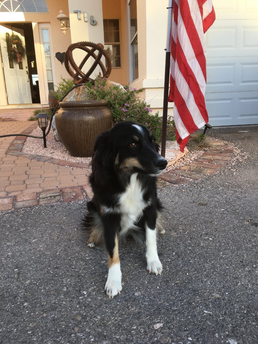 Cynder the accelerant dog waiting at the ice cream shop for her treat.