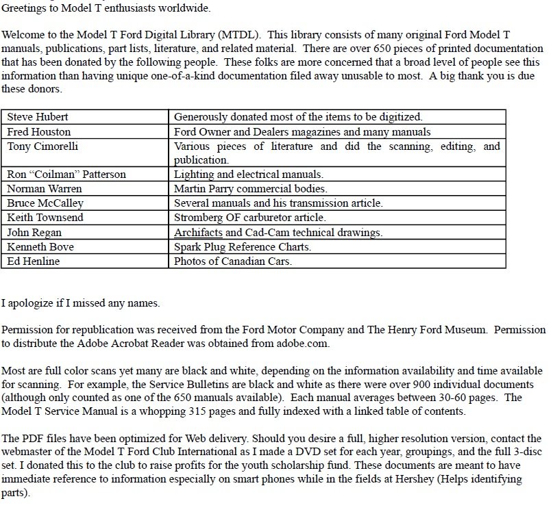 "The Model T Ford Digital Library was created by Tony Cimorelli as a research project and a portion of the library was donated to several Model T clubs. Tony receives no remuneration or kickbacks, nor does he sell these publications. They are available free in an effort to allow enjoyment by all. Semper Fi!'