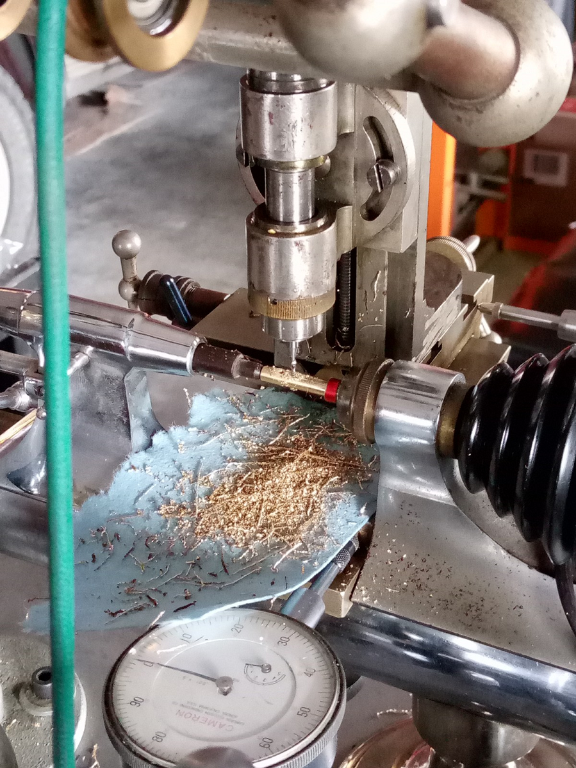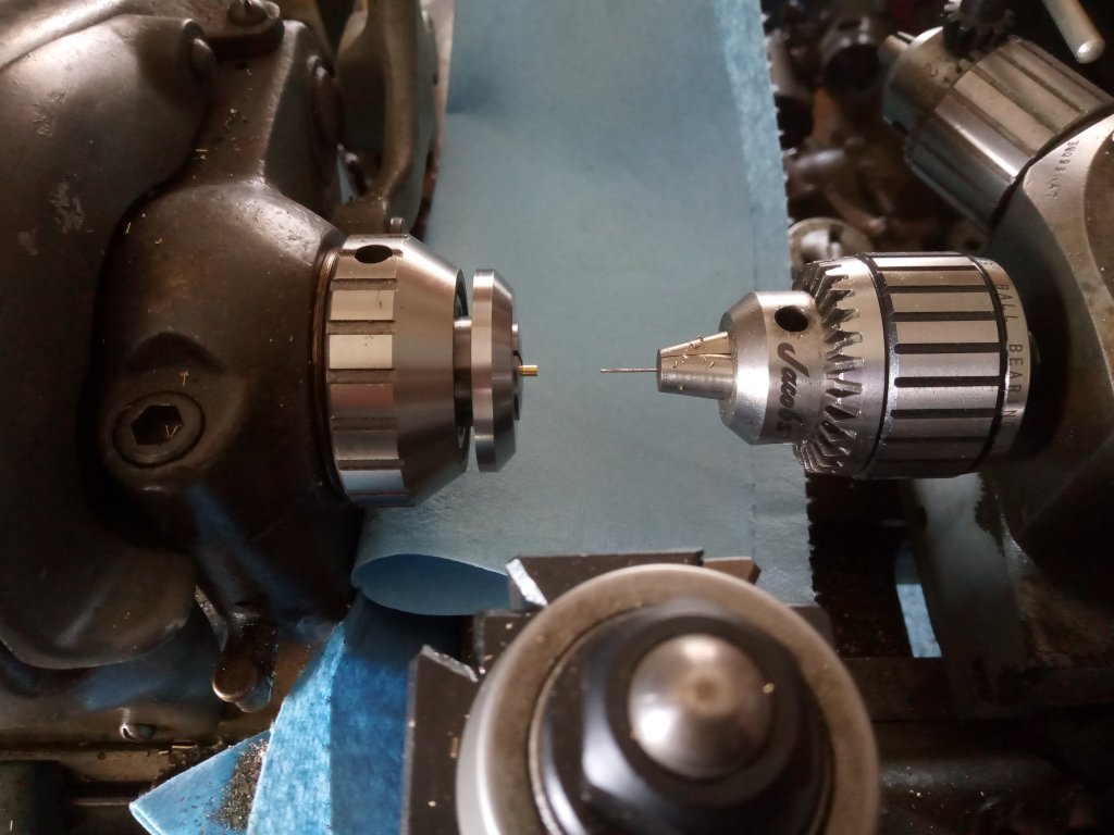 very fine drilling required...next time will have a proper precision hand feed chuck...in this case the drill survived being in the manual turret. Drill diameter used was the very minimum the chuck would take: