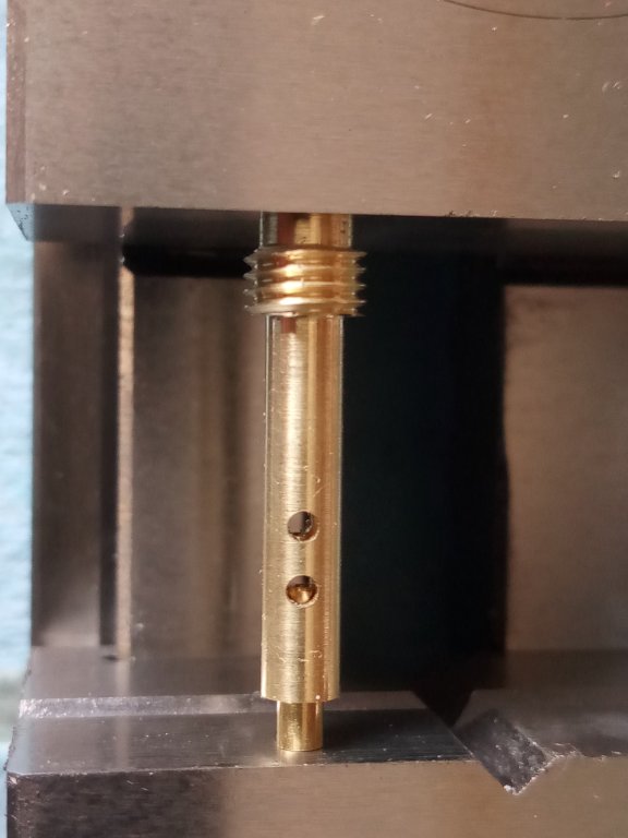first part of assembly (no deburing or cleaning yet). Jet visible in lower hole: