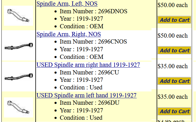 I'm confused as to which is which by the black ones (they have the missing spindle arms) the other complete ones have red paint on the m. The red paint ones look like they are for 1919-1925, Not that they wouldn't work. Spindle arm changes were primarily change to clear the wishbone.bmklawt wrote: ↑Mon Apr 04, 2022 1:57 pmNeed a little guidance, my brain hurts