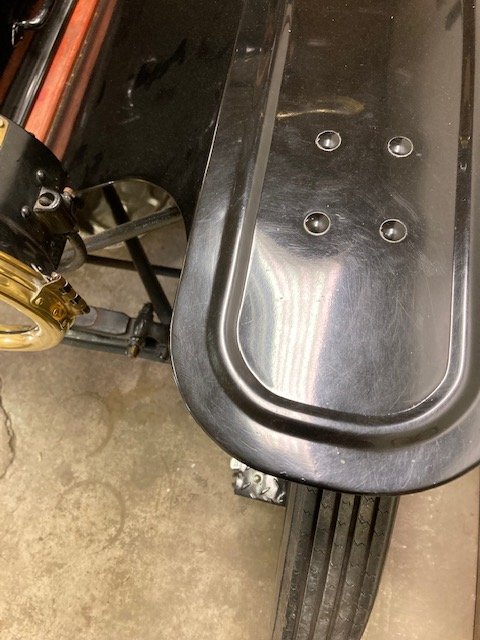 So looking at my Dad's '14, I noticed his front fenders were different. One has the expected three rivets, but one only has two. I can find nothing in the encyclopedia about '14 style fenders with two rivets. Anybody seen these? (the car came with no fenders and these were picked up at separate auctions)