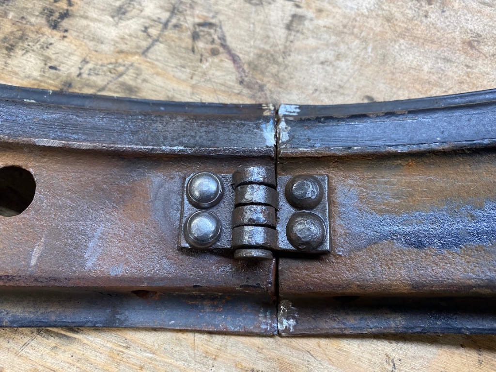 The 1st photo shows the evidence of the hillbilly tack weld, the missing hinge loops, and how the rim split can easily foul those relatively fragile loops. I searched through a friend's junk pile and out of six rims there was only one usable loop fitting, which I salvaged and riveted onto my otherwise good rim. Looking at the Ford service bulletin, it appears that the Ford rim tool probably keeps the two rim butt edges from fouling as the rim is opened or closed.