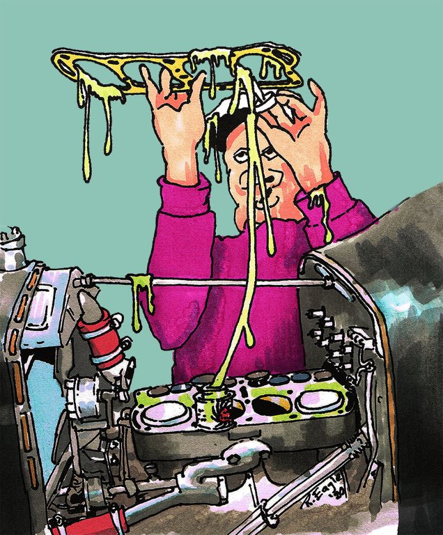 For faster acceleration and higher top speeds, coat everything with several tubes of orange silicon stuff. No need for tedious scraping to get old gasket residue off! Apply orange stuff liberally and slap the head on and screw the bolts down... then fire up and hit the road! Your old car will have incredible new pep and power, just like the newest models, and you'll drive right by the gas pumps! You'll be amazed at the flashing speed and surging hill climbing power as you rack up the best gas mileage you've ever heard of! Oil consumption is eliminated! Leaky valves are a thing of the past! It's an overhaul in a tube! Don't Delay! Order NOW!