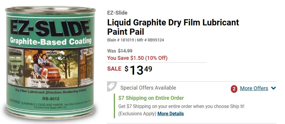 BLB27 wrote: ↑Fri Apr 15, 2022 4:31 pmOne of the suppliers have what they call "Graphite Spring Paint (Also called Slip-Paint)", described as graphite dry film lubricate at $39.95 a quart. Another supplier has what they call "Leaf Spring Paint", described as a black graphite alkyd based lubricating paint. It lists for $18.95 a quart.