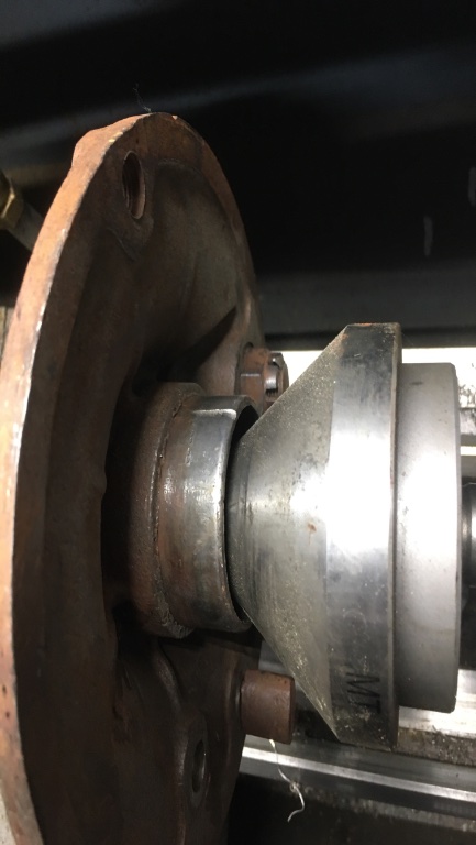Welding the cracks in the clamshell centres warped the mating surfaces between them. I machined a stub to fit in the bearing tunnels and used this to mount the castings in the lathe. Both the mating surfaces and the thrust plate surfaces had to be dressed to true them. When the tubes were fitted. one side needed to be "adjusted".