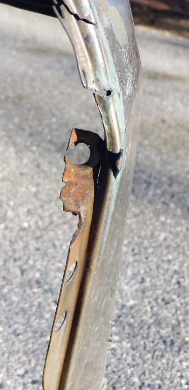 Bill, the damage to your shell is testament to the need for the hood to fit correctly, at least at the front end. A poorly fitted hood will rapidly wear a brass shell if it is allowed to rub on the shell. I have saved one not quite so damaged as yours. It needed parts from a donor shell and a small fortune in 40% silver solder. I am not clever enough to braze thin brass.
