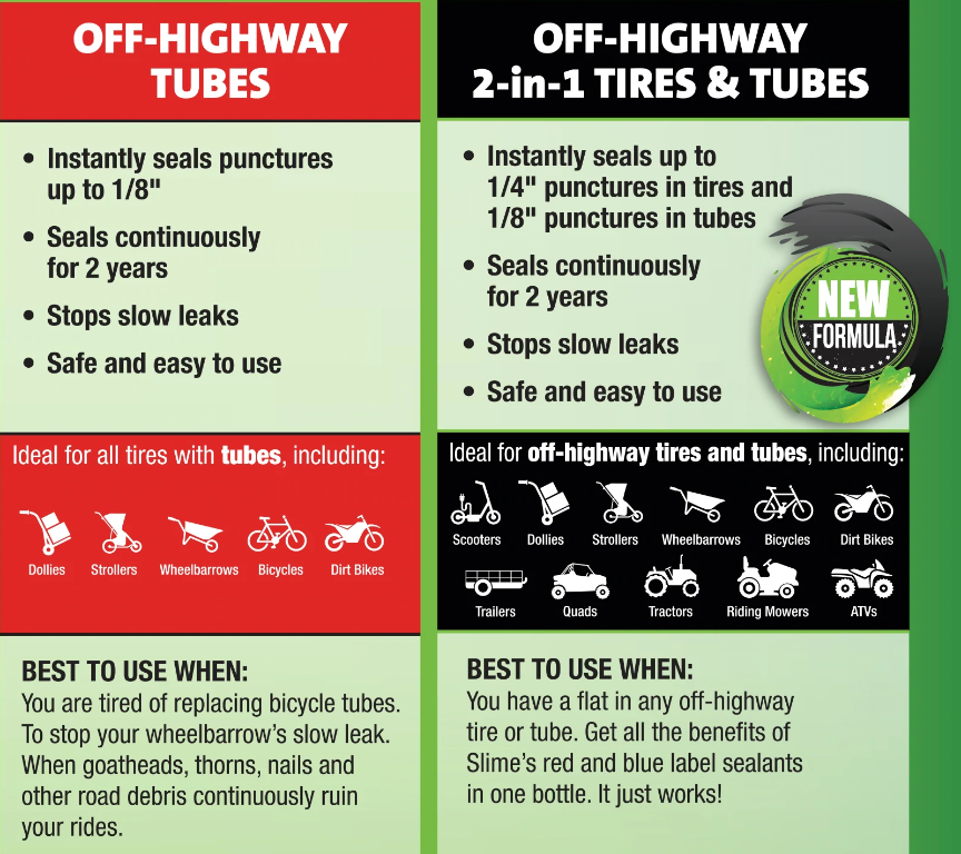 Slime comes in four formulations. RED & BLACK for Tube type tires and neither is recommended for tube or tubeless tires traveling over 45mph