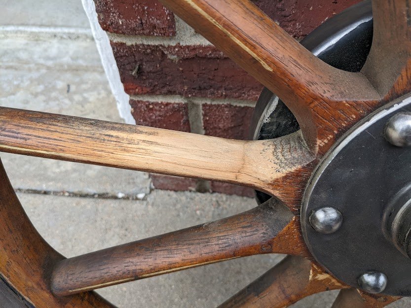 This week I started working on the wheels removing the paint from the rims and hubs. The original paint had been removed from the spokes likely when the car was repainted in 1949. My unpleasant surprise was finding one of the spokes on a rear wheel is cracked, as the two pictures below show. I restored a 15 runabout 3 years ago and it had loose spokes so I had Stutzman's rebuild them. They do beautiful work. I talked to Noah yesterday and there prices have gone up noticeably since I had the runabout wheels rebuilt. I guess high inflation also has impacted them too.