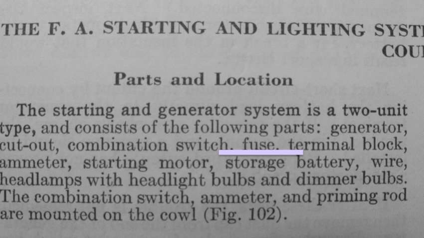 I've been playing with electronics since I was a kid, had a Ham license for over 50 years. Fuses are installed to protect wires carrying substantial current. For my T, I chose to install an automotive circuit breaker in the equivalent of the "yellow" wire mentioned previously. Maybe Ford chose not to use them, but as someone who has seen the results of a melted wire, I see no issue with using one. My '17 never had an electrical system per se... I've installed a starter, electric LED headlights, sidelights and tail lights, so I've felt free to design an electrical system that suits my needs.