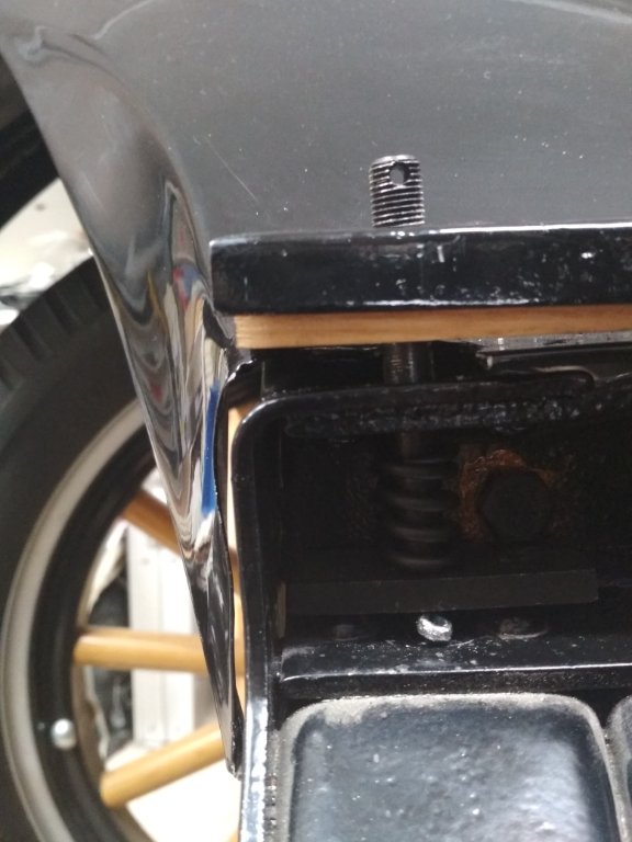 Here is a drawing I in made in 2012 in answer to the order of assembly. John is correct. The wood block under your shelf is way too thick! If you were to install it that way, the louvered hood sides would not fit at all properly and could not be secured by the hood latches. The wood blocks should be exactly the same thickness as the inside height of the metal shelf. The shelf should sit on top of the wood blocks without the wood being visible, while still providing support to the metal shelf without the shelf making contact with the underlying steel fender. If the old wood blocks were that thick, they were wrong too. Even with the correct block thickness, I had to hammer a temporary 1” thick wooden wedge under the threaded stud to keep it as high as possible in order to expose enough thread above the assembly to install the small spring, lower and upper thimbles and top nut. The lower “washer nut” should be threaded as close as possible to the to the lower cotter key to provide as much thread above the assembly, as possible. Of course, the wood wedge must be removed after the assembly has been completed. Jim Patrick