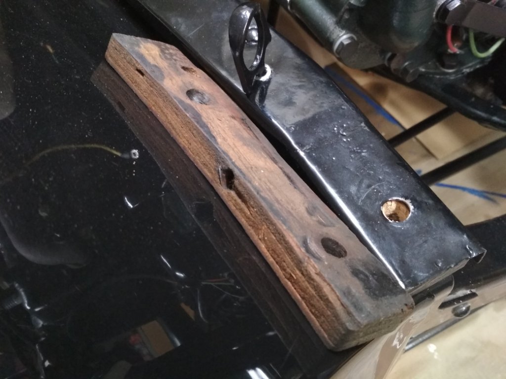 I doubt that the old hood riser wood was factory (it's plywood), but the hood fit just fine with those pieces and they're as thick as the new ones. They conform to the frame though, kind of like steam bent wood effect. I think that by having all the screws tight on the hood riser it is making the front angle upwards, so I'm going to loosen the whole thing and see if the front will come down some for mounting the radiator, then with time the new wood will end up conforming to the frame like the old pieces did.