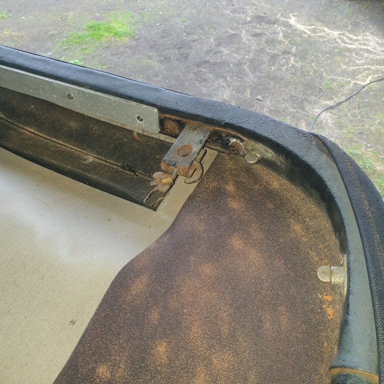 The left is correct for one man tops 23-27. The right, I have not seen before, but in researching better than stock options for top tie downs on 17-22 ,I suspect its part or an after market non strap method. There would be a rod to pick up the lower W/S hinge To meet that neat clamp attached to the front bow as seen in model T accessory adds.