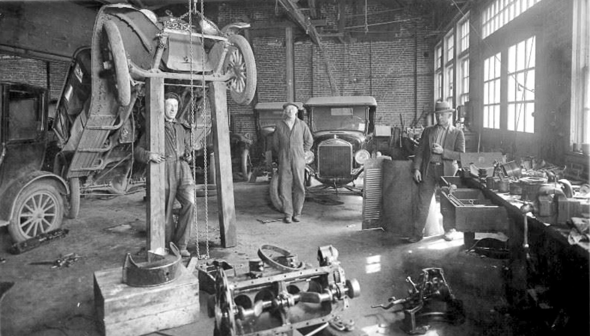 That is a terrific photo and I love it every time I see it. The detail of parts scattered about the shop is great. Not to mention the prospect of beams slipping.