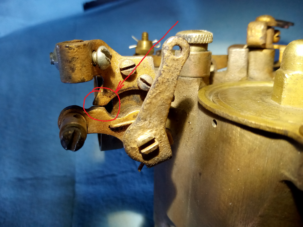 Here is the tab bent "out", limiting the amount of choke applied from the driver's seat, but can be overcome by the operator in front of the car by pulling the choke wire and energizing the coil spring (see circled area). as an additional note, this carb has the float bowl vent at the top side of the bowl - this carb would have a NON-VENTED float rod nut: