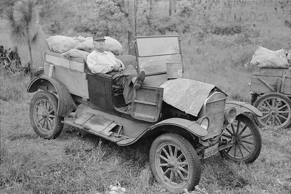 "Farmer sitting in broken down Ford truck waiting for garageman near Amite, Louisiana(1938) by Russel Lee"