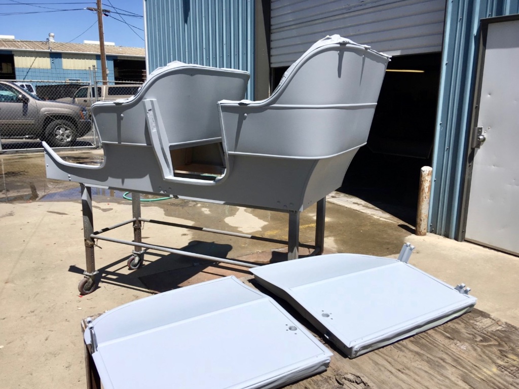 Back to the touring. Body up on roller and we move towards prep work. First I treat all the raw wood with a lacquer sanding sealer. It’s old too. The kind they used to use on school floors. Unobtanium. I brush the parts that are exposed to exterior paint work. The inside wood and bottom side wood I’ll paint by hand after all the spray work is done on the exterior. If you don’t seal the wood where you spray, the wood will suck and suck the paint in. Not good to put layer upon layer of paint on wood. And don’t forget to do the seat overhangs.