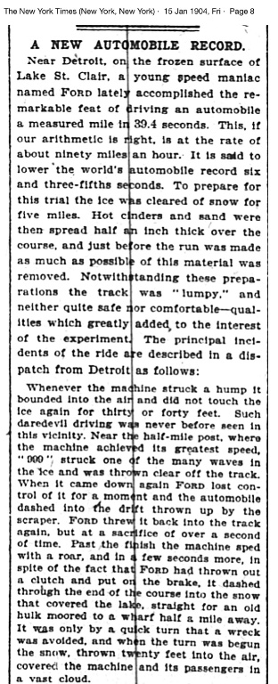 "Near Detroit,…… a young speed maniac named Ford”. "The New York Times," January 15, 1904