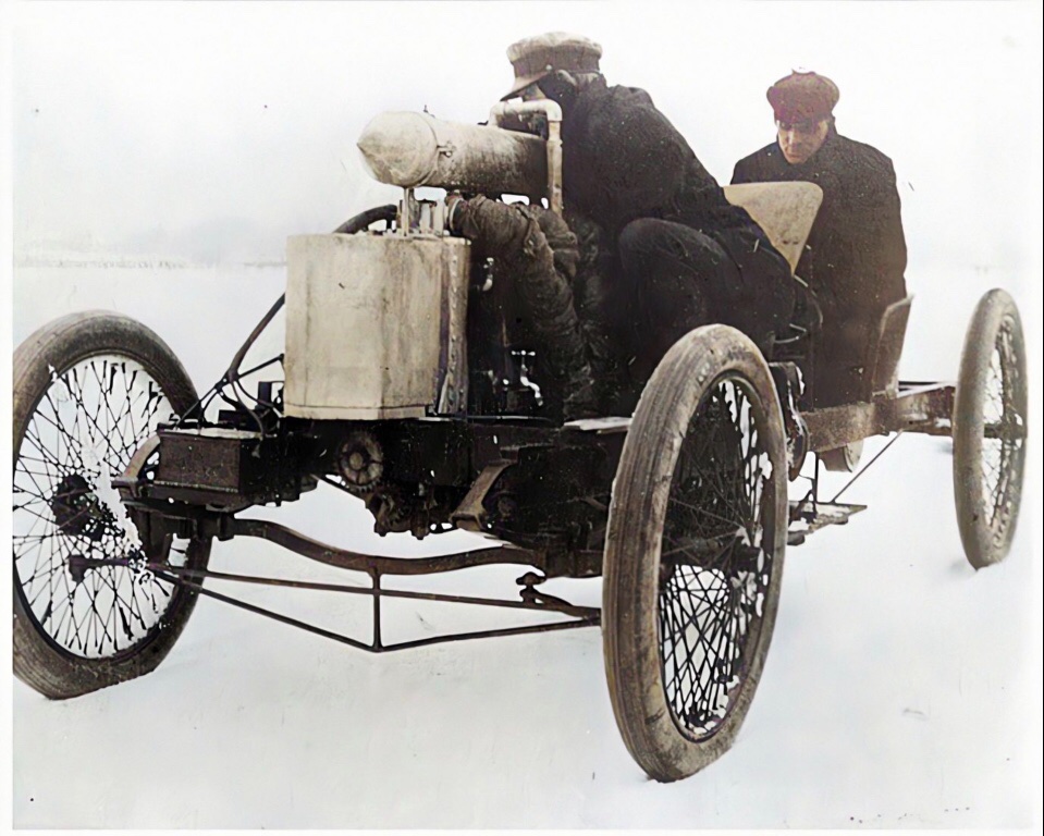 Below, the reason Henry Ford was able to set the one mile world speed record in early 1904. Frank Day died driving 999 (actually Arrow) at the Wisconsin State Fair (Wisconsin Miracle Mile?) in the fall of 1903. Tom Cooper sent the racer to Ford to rebuild it. If you notice, the tiller (wreck) was replaced, and the drivers seat moved from the center of the racer to the left side, among with other improvements.