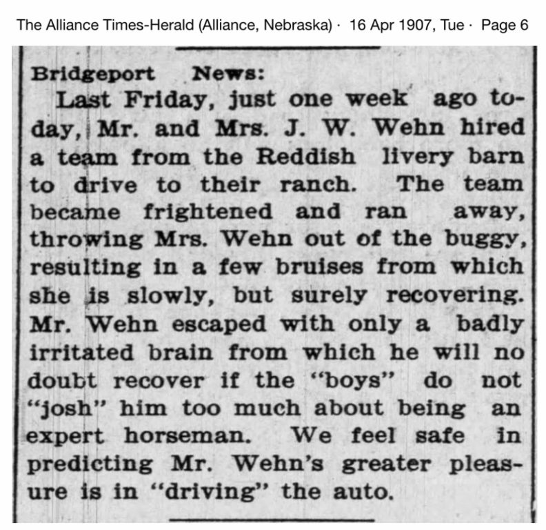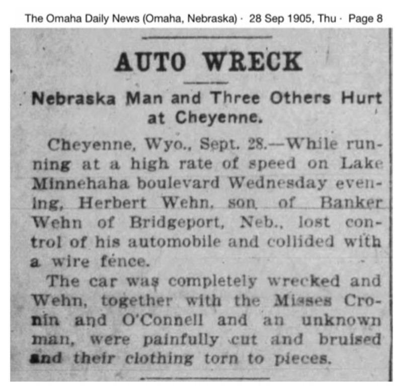 By 1905, they also own an automobile. In late September, 1905, Herbert Wehn, John's son, is involved in a wreck while racing his automobile in Cheyenne WY. The reports indicate it was a 30 horsepower machine purchased in Denver: