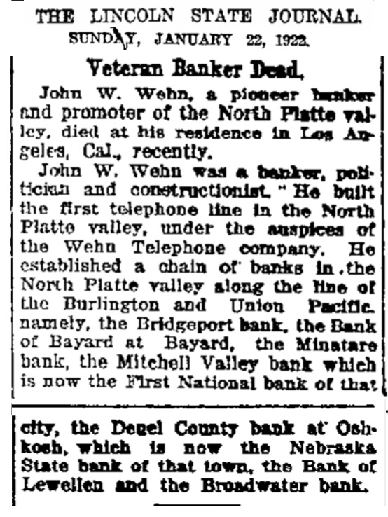 By 1905, the Wehn family own several banks in western Nebraska, as well as the first phone company to establish lines between Alliance, Bridgeport and North Platte.