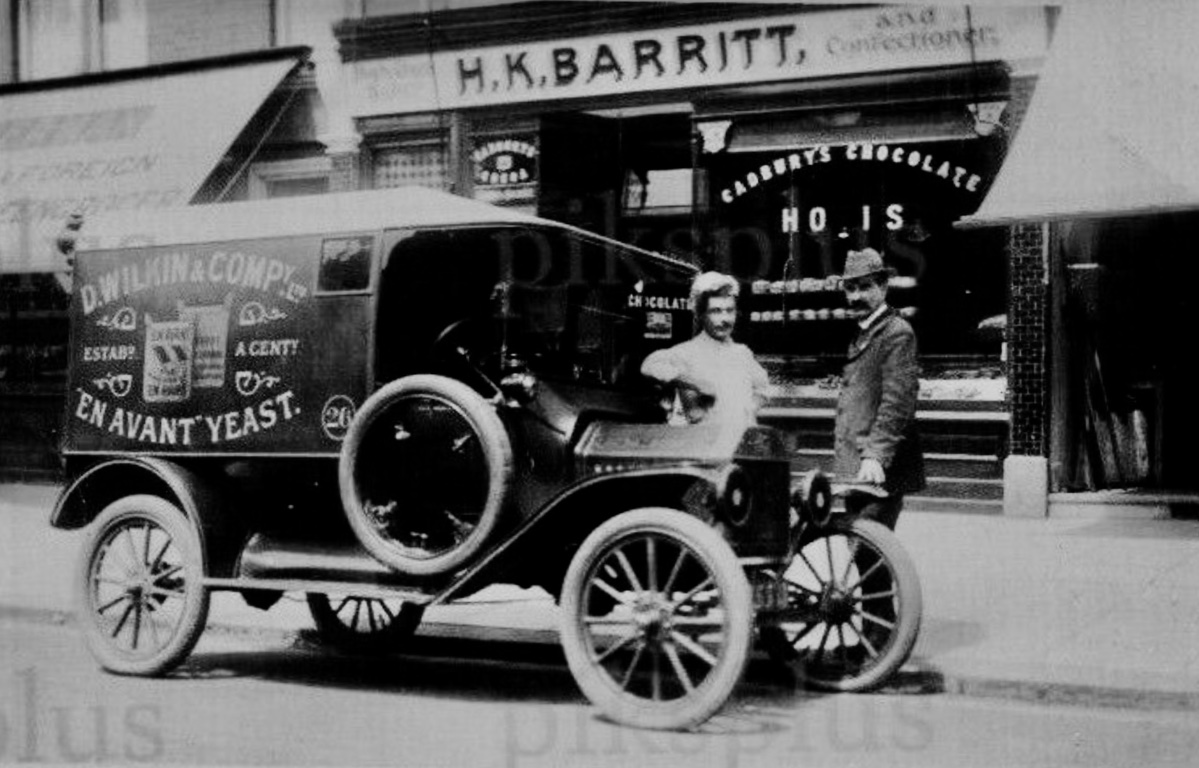 The D Wilkin and Company van is likely an English bodied car, typical of the way their vans were styled. It appears to be a RHD 1915 model. The partially blacked out headlights were a WW 1 response. The spare wheel is a Stepney wheel. It clamps to the rim of the flat tyre and allows the car to be driven without having to make a repair on the side of the road. I had one but never had occasion to use it.