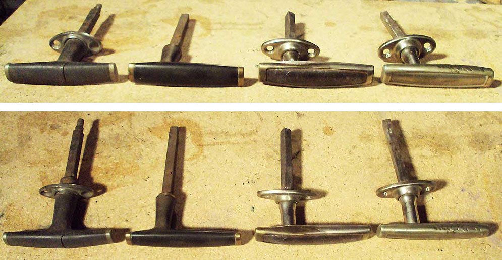 In the first post one of the handles look exactly like one I had on a 31 Model A Phaeton many years ago. I had an extra handle and I used it for the parking brake handle on a 67 Dodge dart, which came with a plastic handle which would break if you pulled it on hard to hold the car on a hill. It never broke after I put the Ford handle on it.