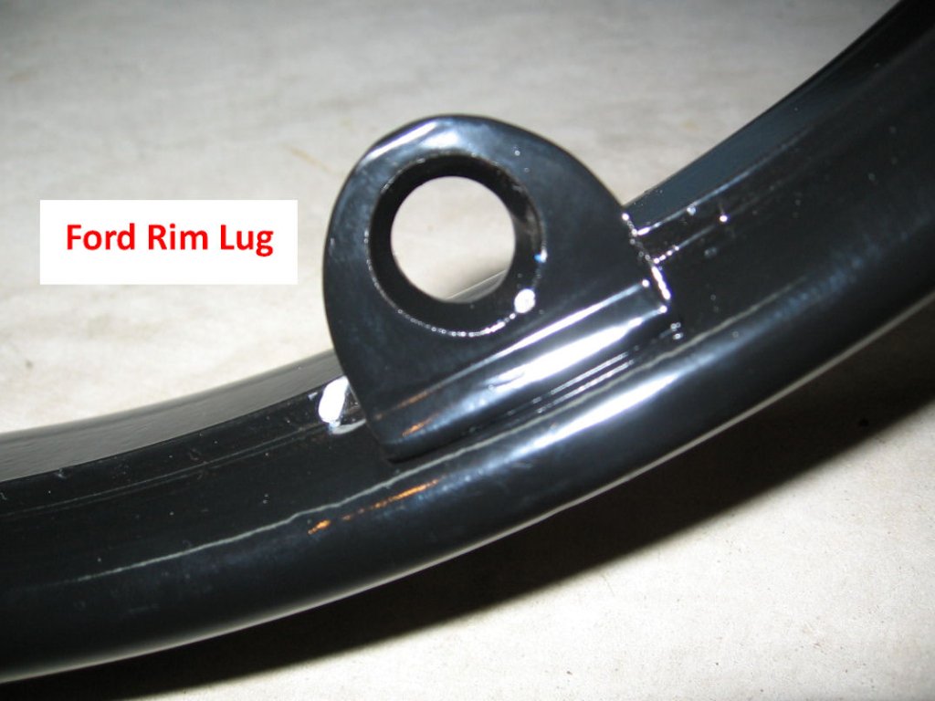 The rims for those wheels have no lugs other than a bridging lug that fits over the rim bolt nearest the valve stem. This prevents the rim slipping on the felloe and taking the valve stem out with it.
