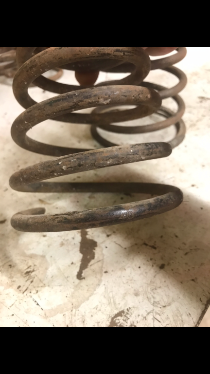 I am putting out a request for some data on stamped Hassler springs. My hope is that as a collective unit, we can piece together data on stamped springs such that unstamped springs can be identified by measurable aspects such as wire diameter and free height. I have a 39 and a pair of 40 springs (along with a whole bunch of unstamped springs that have long since lost their color-coded painted ends). The stamp is on the side of the bottom coil, about 1/3 of the way around from the end of the wire.