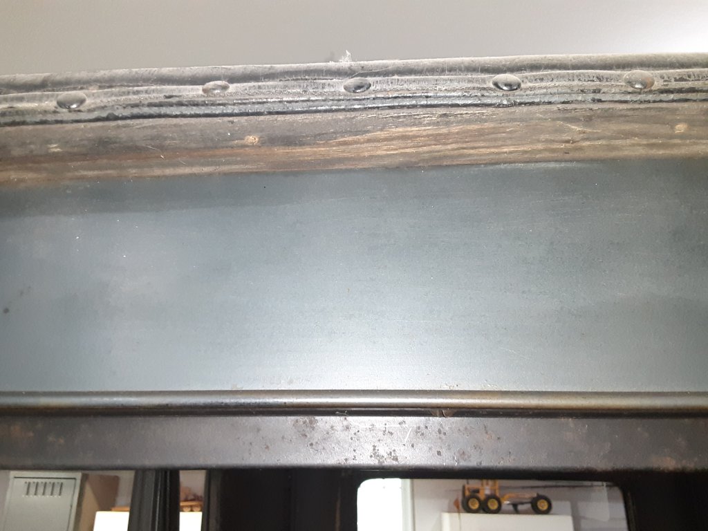 The trim piece used across the front is also a commonly used item in early auto/buggy upholstery sometimes called tape edging. This type of tape edging was used on the bottom of the front seat cushion in the '26-'27 fordor sedans to finish off the raw edge of the seat material to give it a more professional look when it was lifted to acess the fuel tank. It is a thin black vinyl strip folded over itself. The large, black enameled nails were also used on the touring cars to hold the front kick panels in place. These are also current available.