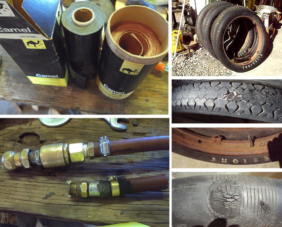 Yesterday I managed to repair and install 5 tires and tubes. Having all the tools and supplies out makes it faster and easier. Some rolls of patch material were found a while back and work nicely. I also rescued 4 innertubes and will get them inside tires soon. Two leaky rubber stems were replace with brass stems. I have retired 3 of my Firestones that I bought in 1964. They have given good service on various cars for 58 years. The most recent was the Rusty Coupe. The sidewalls, tread and beads are not fit for full pressure any more but will serve fine at 30 lbs for yard equipment. They cost me $46 a piece when new but I think they were worth it. I also have a set of Wards Riverside's that Rich B. bought about the same time. They have seen more indoor service and will be used as needed in the future. Those old tires and tubes were as good or better than any I have purchased since. I also took the time to better fix my air hose. It's two inches shorter but I believe I can get by with it. One rim had an extra hole in it. Perhaps to fit a Chevy or other valve stem location. I have had to put a "boot" in that location to use it. One old patch has cracked with age while hanging in the rafters. I did several repairs like this a few years ago and ended up with 8 tubes hung up and not in tires. The old ones were in good shape but more recent ones had cracked where they kinked while hanging. Shown here they are a Coker Tire Co and an Antique Tire Co (Taiwan). I'm sure these gave hundreds of miles of good service when new but didn't like the open air in later life. Maybe I'll try to patch them while I have the cement and patch material. Not in something I drive though. The materials are different and sometimes patches don't hold. I learn a lot in doing these tasks and am passing on what might be helpful to others.