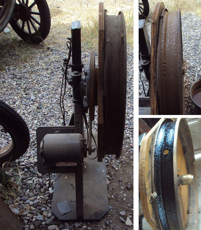 For now a little heat and then some pressure seem like the thing to do. This patching gum works pretty well cold too. You can see how it worked around the patches after the heat and pressure. I am letting them sit overnight before putting air in the tube. Having tires and tubes on the current rims I needed to find a rim for another good looking tire. I mounted a useable rim from the pile on my rotating stand and wet sanded a lot of dirt and loose rust from it. It turns about 50 rpm and eats a half a sheet of 80 grit in 15 minutes or so. This gets them clean enough for a coat of Por-15 or in this case a coat of tractor paint. The swishing sound of the sandpaper and water is a bit like the air coming out of a tire. Low and behold, when I stopped the sanding I could still hear that sound. At breakfast a fellow told me it looked like I had a low tire on the Coupe. It was down to 25 lbs but got me home fine. I had parked near the air hose and filled it to 45 lbs. I had been cautious in riding on 35 lbs in these old tires for years but increased these repaired ones to 45 or 50. Filling the tire today was just too much for it and it ripped a 4" tear in it. That will be more than I believe is patchable today. I replaced it with a tube that has held air for several days. It has some cracks in creases and will let go at some point like the previously mentioned one. However they often last months or years before failing. I added a flap this time and will see how it lasts at 35 lbs. This tire is about 30 years old. It has a rim cut as 2 sets that I used on the Speedster got in them one year. That is when I started using flaps. They are much more flexible and easier to mount. But with the rim cuts I will use less pressure. They don't seem to get worse driving around town. There is something new each day and I hope some of it has some value to relate to others. The story gets longer. The more I do the more I learn and can apply to more serious tires on the other cars.
