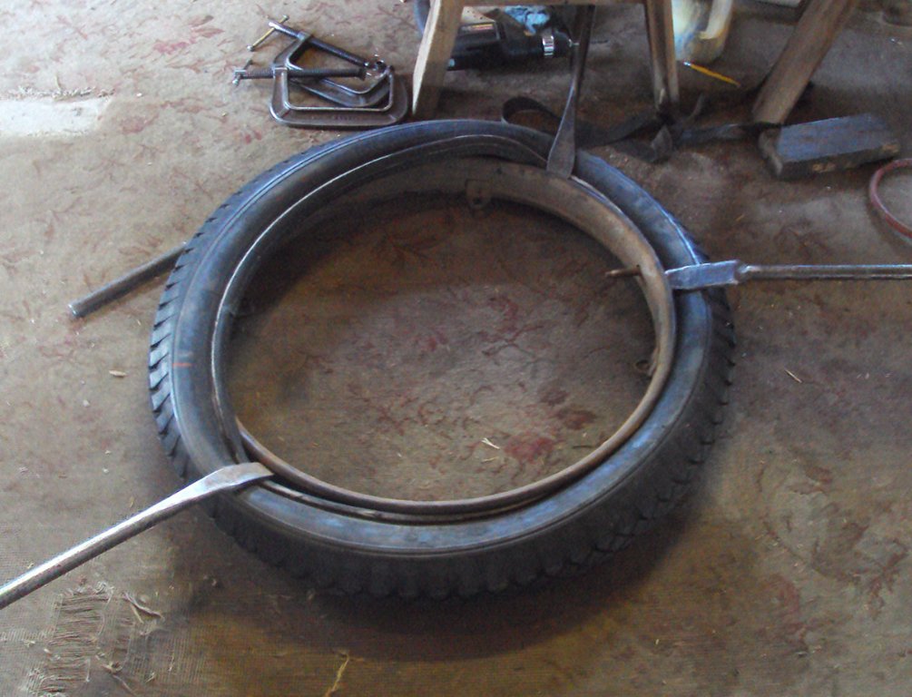 Yes, talc (talcum powder) is often used to great advantage in helping the tube move freely in the tire. With the Vaseline like stuff on some flaps and then testing the water tank I wonder about a sticky mess. I haven't tried it but I may. The 30 year old Firestones I spoke of are flexible and I can pry them off and walk them back on in a few minutes. That may be why they slid on the rims and got cut so easily. Contrast that to this stiffer old Riverside. It seemed the bead was going to tear before I got it stretched on today. I used bench weight on a sawhorse to hold one iron down. The stiff beads made getting the tube and flap in place more difficult but it is holding air now.