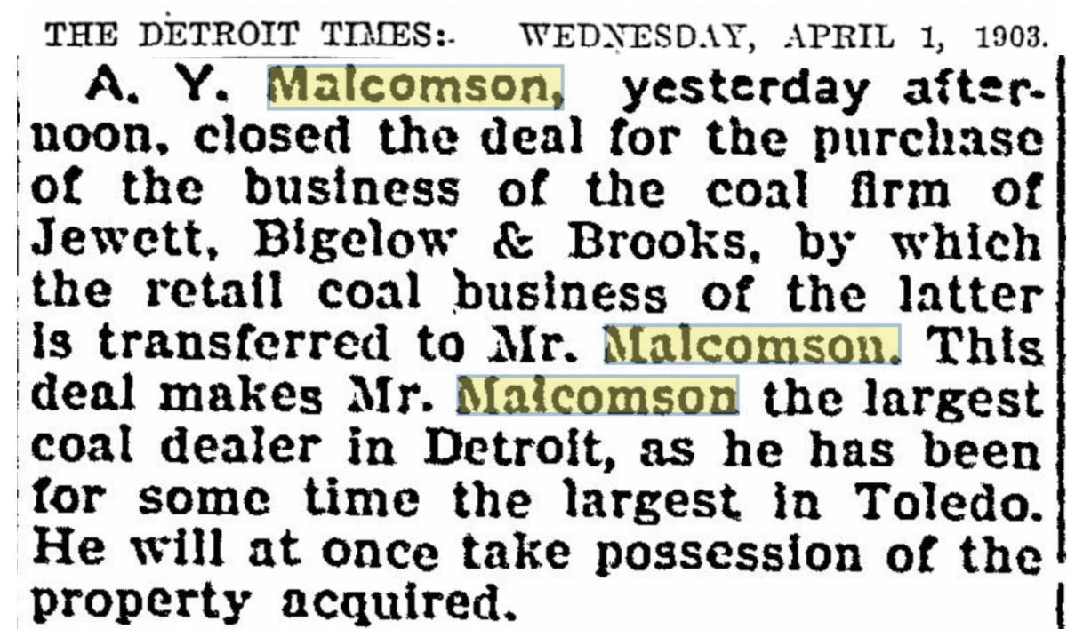 As of 1903, Malcomson is the largest coal wholesaler and retailer in two growing major midwestern cities, Detroit and Toledo. As we'll see in 1905, he is a busy man, with business interests in several areas: