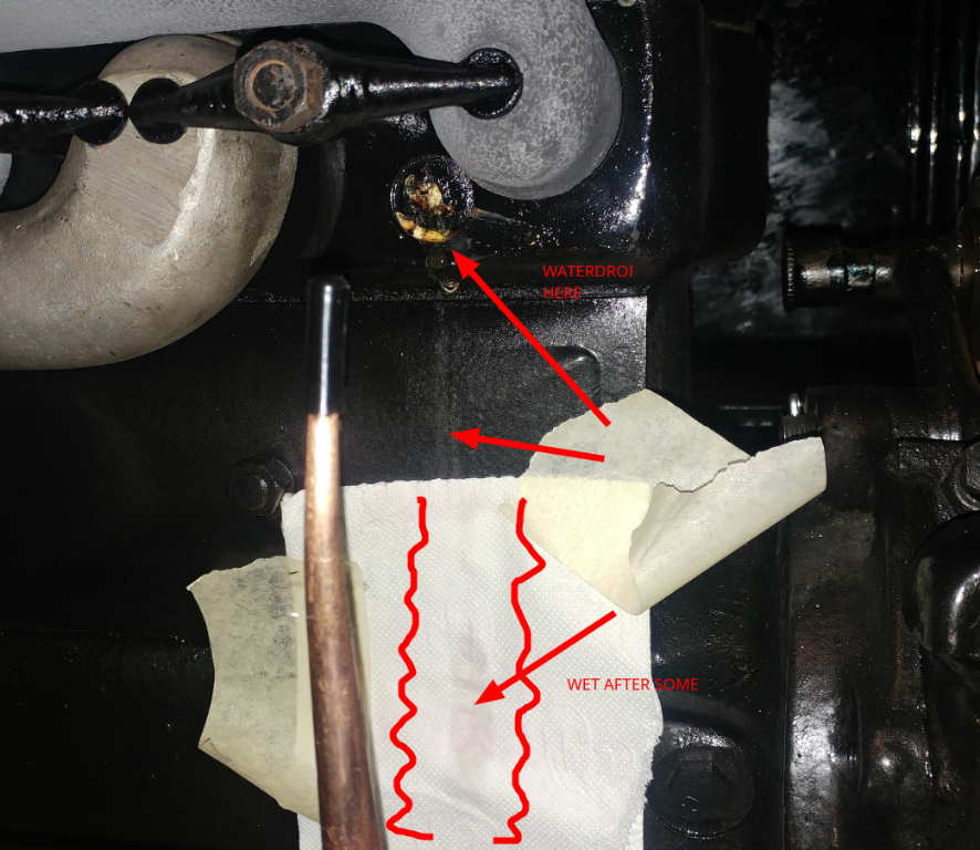 Today I had a look if the radiator is leaking and saw some water drops under my Lizzy on garage floor, but they were at a place where water from radiator cannot get to. The droplets were below the front end of the engine block on right side. I started searching, but the radiator appeared absolutely dry. I placed now some kitchen paper between crank and bottom of radiator. When the radiator is leaking, I will see this on the paper tomorrow.