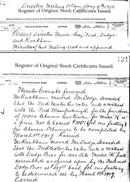 The same directors then moved "Ford Motor Company enter into a contract with Dodge Bros for 1,000 sets of "Model K" parts assembled as agreed upon by Mr. Ford and Dodge Bros. At $427.50 each."