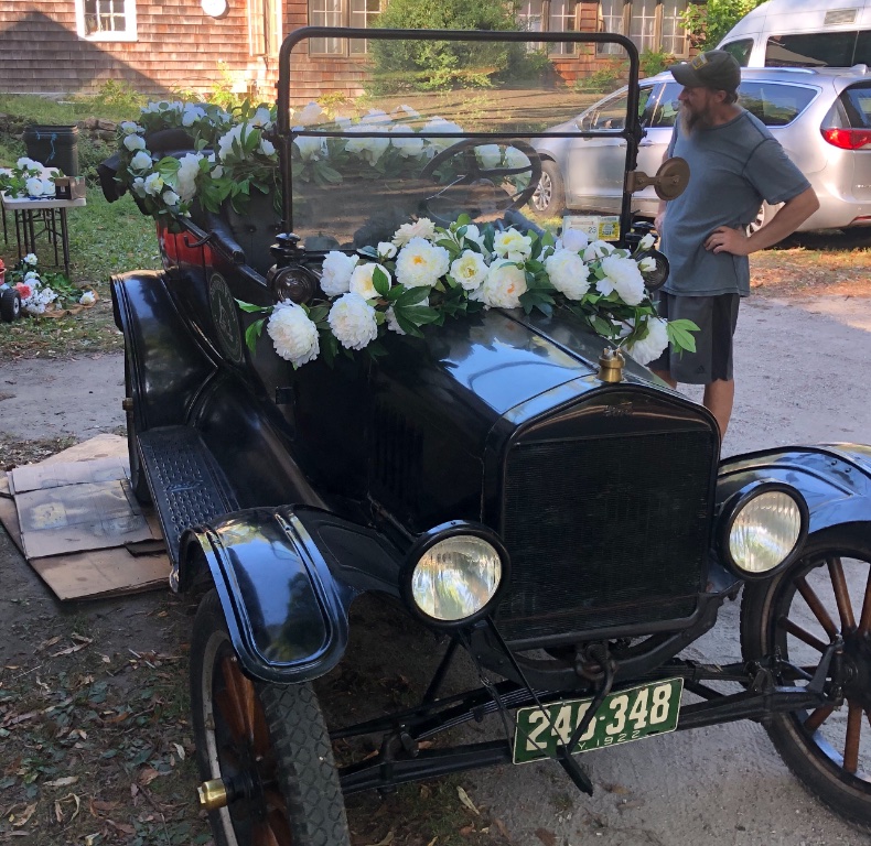Here are a couple of pictures of the car decked out for a wedding, and the TT that was used this Sunday at our Fiddle and Folk Fest for our open mic. The person who runs that part of the fest says that we get more sign ups because of the truck stage!