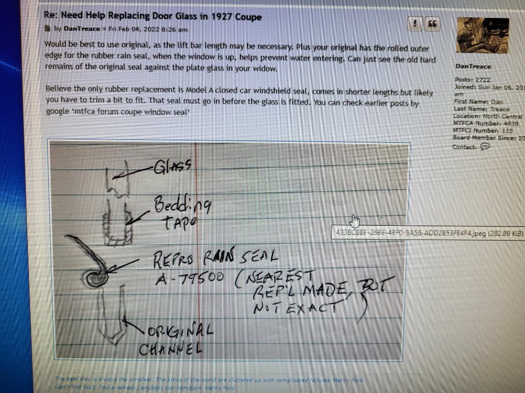 Here is a reminder of the photo you posted back in August, 2022, of the cross-section of the original door window weather seal which looks to be much shorter and stubbier than the rubber weather stripping you currently have installed. I think Scott is correct that, what you have is the 1926-‘27 weather stripping that spans the bottom of the windshield frame. It may work on you door window if you carefully cut it down to the dimensions of the original. If you saved the original piece, it would be easier to make it match. It would be easier to make the cut nice and straight if you slid it out and laid it straight and flat to cut it. Jim Patrick