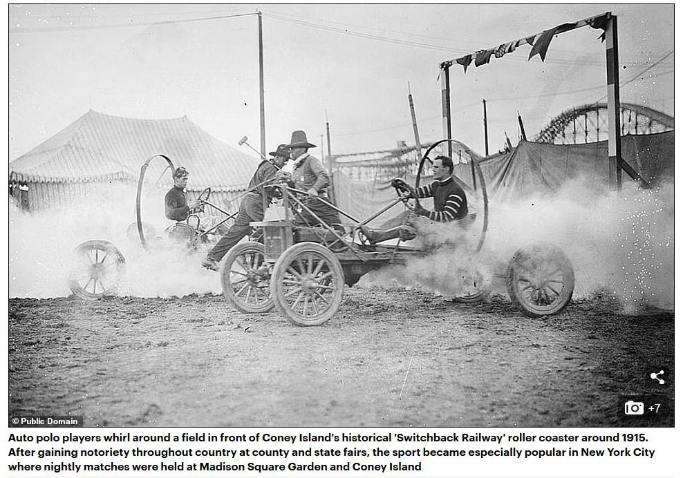 Jason G and T-Tim E, Those are two of my favorite "staged" auto polo pictures. They have been extensively discussed in years past. Really fun to blow up and study closely. One of the first tip-offs is that none of the wheels are spinning. The film used in those days was fairly slow, a spinning wheel will have the spokes blurred enough that you probably could not even count the spokes. Notice, the fellow flying through the air is slightly blurred, and he isn't moving very fast. He may have been standing on top of the front wheel (speculation), and the other fellow in the other car also poised. Once everything was blocked and ready, the cameraman counted down. The one fellow dove off his wheel, the other rolled out the side, and the photographer squeezed the shutter. In a real action shot, at least one of those airborne wheels would be spinning. A little cut and paste (literally), and blocks or jacks disappear.