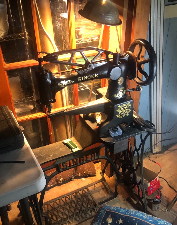 I’ve been lucky that it’s been basically a bad cold and got the five day drugs that supposedly help getting back to normal. While sequestered I decided to make a tonneau cover for ‘Bell’ as I had made a ‘regular’ top cover earlier and thought a tonneau would be fairly easy to put together. I’ve got a couple of tools that help and a giant roll of a black cloth on one side and a golden rubber on the other side waterproof material to work with. One of the tools is a modern heavy duty Singer sewing machine that can sew up to four layers of the material, the other is a 1911 shoemakers machine that will sew through up to a half an inch of leather or soft materials and has a head that allows the user to sew in circles without moving the material being sewed. I’ve used this machine for all kinds of projects over the years I’ve had it. Recently I’ve used it to replace the leather crank holder, make new leather straps for the cracked and deteriorating ones on the car and other assorted tasks.