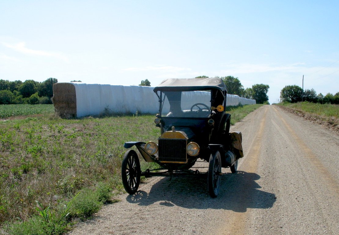 I left home at 7:10 AM Saturday. The 1915 runabout ran great across the first southeast Kansas counties. With the recently installed Holley G I was able to high gear a hill that I previously had to low pedal. But that running great had a serious break when I spent over two hours in the Coffeyville Walmart parking lot reassembling and reinstalling the muffler. That was the second time I've had that problem, and it will be the last. When I get home the muffler will get welded.