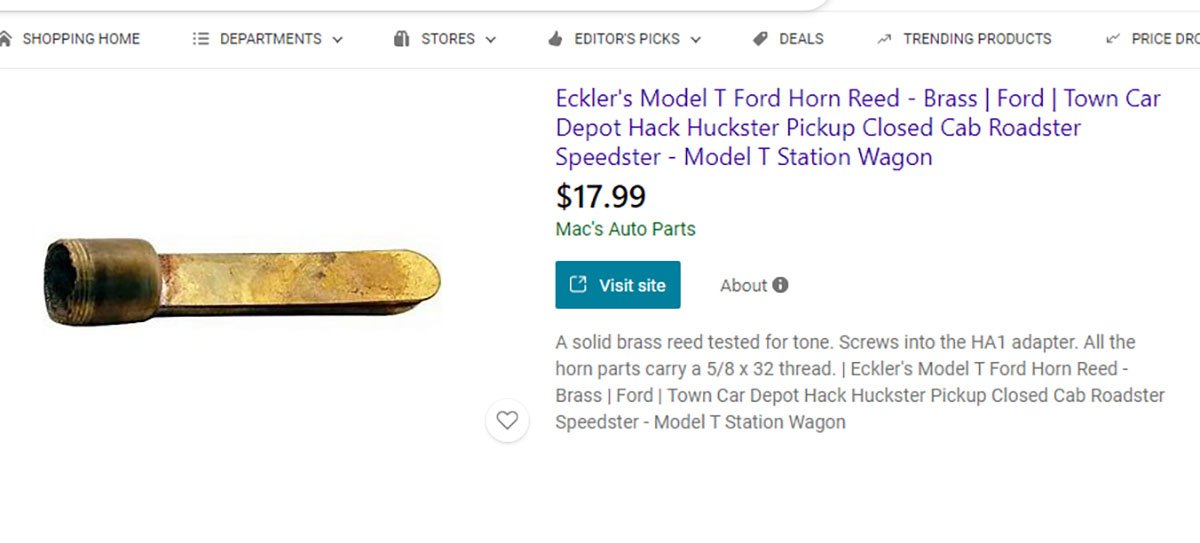 If so the reed if it’s original is located near the horn side of the horn. The reed is a push in type meaning it pushes into the horn. All the repos are a screw in type. If your reed is broken you will either need to find an original push in type or if you get a replacement repo you will also need to change out the horn reed adapter and a threaded adapter that covers the reed as well. The repo reeds use a threaded end instead of the push in style and the horn reed adapter and the threaded adapter use a 5/8 x32 thread. The earlier and original horn reed adapter and threaded adapters used a 41/64" x 27 thread. In 1915 model year Ford changed to what I presume was the industry standard at the time, 5/8 x 32 which is what Vintique uses for the reproductions that are carried by all the vendors. The horn reed if it’s a push in is soldered in the horn reed adapter. Hope this helps.