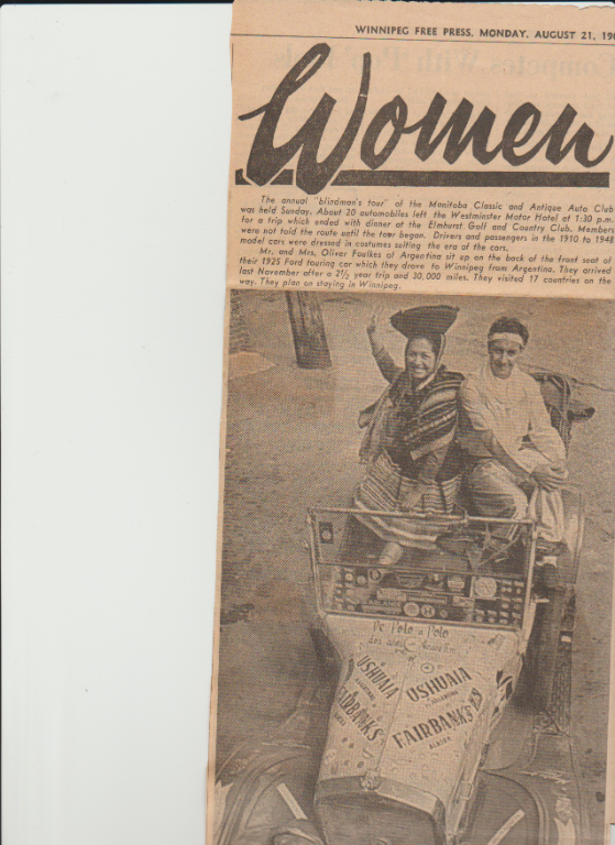There was a 1920s Model t touring in Winnipeg in the mid 1960's it was driven from South American through the states and wound up in Winnipeg. I was just a kid but I remember the car and the if memory serves me correctly it was Oliver and Bertha Foukes the car was a yellow body with red fenders later they moved to Toronto. I will look for pictures.