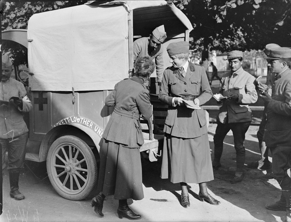 Would that be Toupie Lowther under the first truck with her medal she was awarded painted on the canvas side? She was a tennis star during the day and organized an all-women's ambulance corps and was awarded the Croix de Guerre for her service during WWI