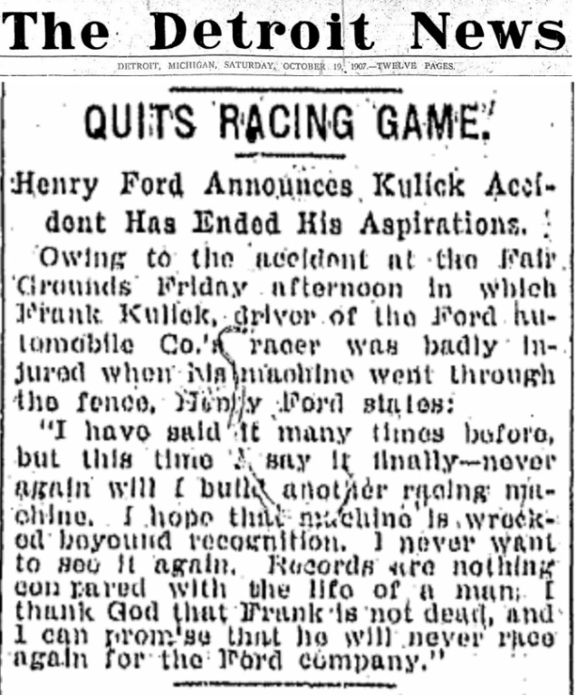 A few days after the wreck, newspapers and journals across the country carried the story of the Kulick accident, as well as Henry Ford's decision to leave racing for good: