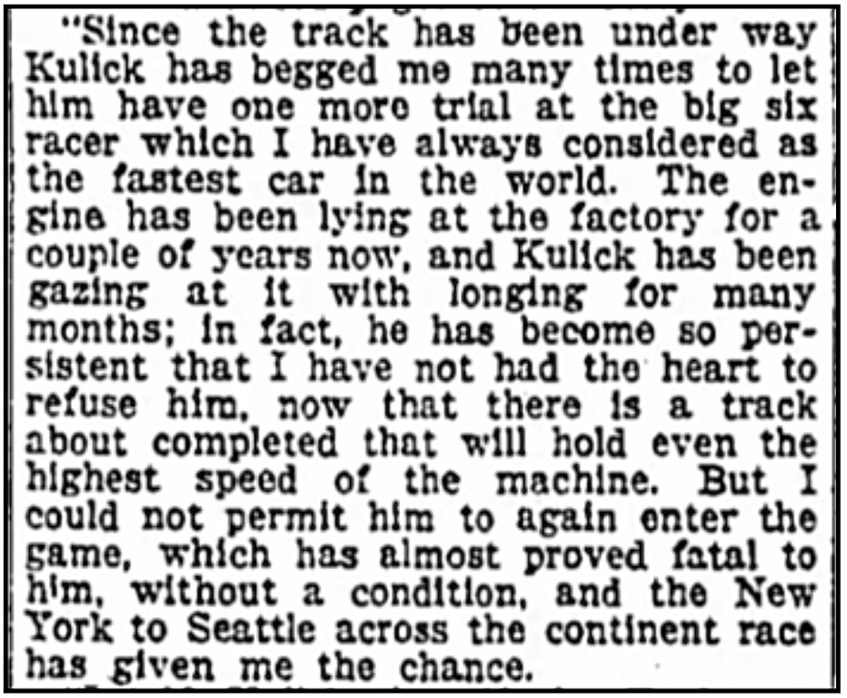 Henry Ford went on to say "Since the track has been under way Kulick has begged me many times to let him have one more trial at the big six racer which I have always considered as the fastest car in the world." "The engine has been lying at the factory for a couple of years now."
